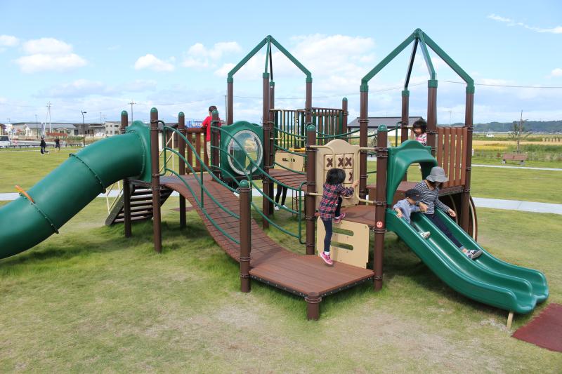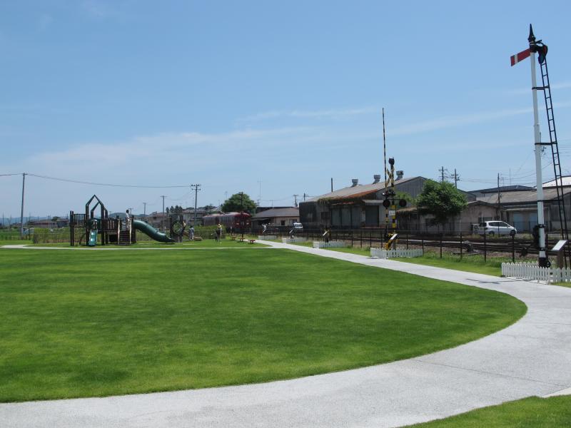くりはら田園鉄道公園旧若柳駅および直売所くりでんに隣接する芝生広場内には、実際に使われていた踏切や風速機などのモニュメントがあったり、機関車をモチーフにした遊具もあります。