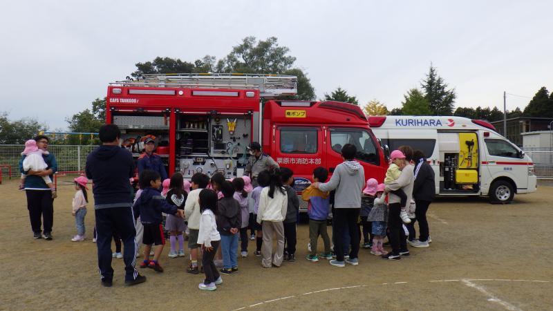 今年度2回目の自衛消防訓練を行いました。車両見学では、消防自動車だけでなく、救急車も見せていただきました。救急車の中に実際に入らせてもらい子供達は大喜びでした。