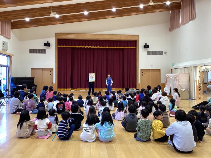 栗原警察署生活安全課、瀬峰駐在所の警察官が来園し、防犯(不審者)に関する「はちみつじまん」の約束のお話を子供達にわかりやすく教えていただきました。