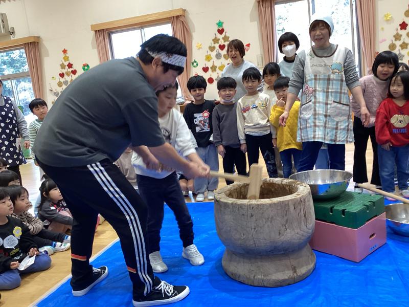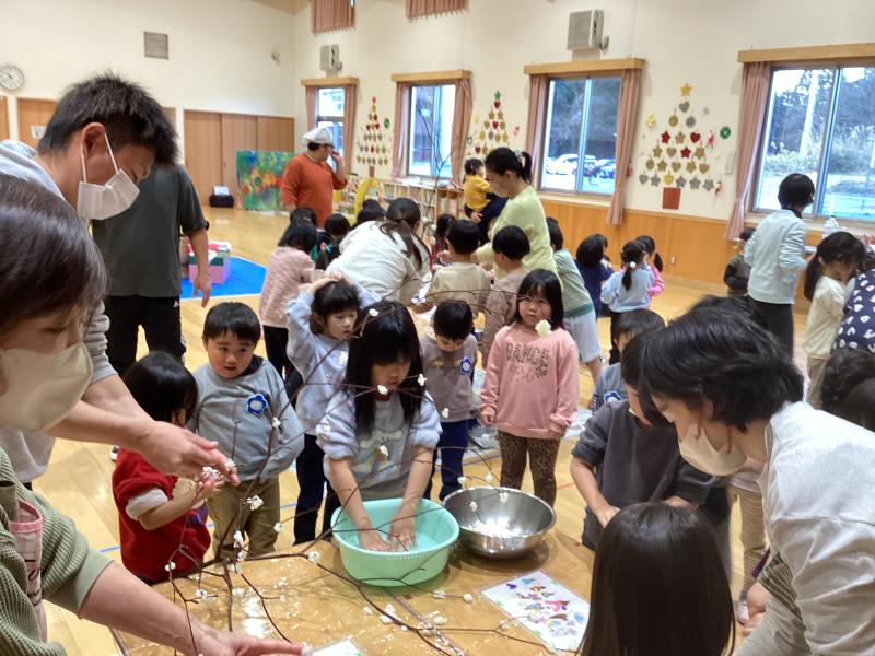 お正月の「水木飾り」を作りました。役員さん方にも手伝ってもらい、臼と杵で餅つきに挑戦しました。来年も良い年になりますようにと願いを込めて、つき上がった餅を小さく丸めて水木に飾りました。