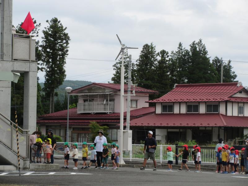 水害の避難訓練を実施し、鶯沢小学校の外階段を利用して2階へ避難しました。