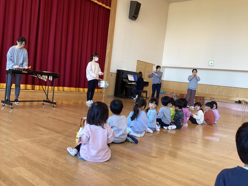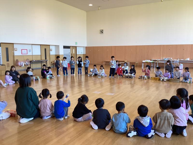 誕生児のお祝いに、先生たちから、楽器を演奏して音楽のプレゼントがありました。本物の楽器の音を聞いて、自分たちも楽器をならしてみたくなり、全学年で手作りの楽器を使用して「山の音楽家」を演奏しました。楽しい誕生会になりました。