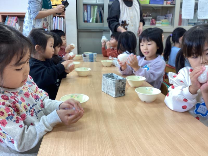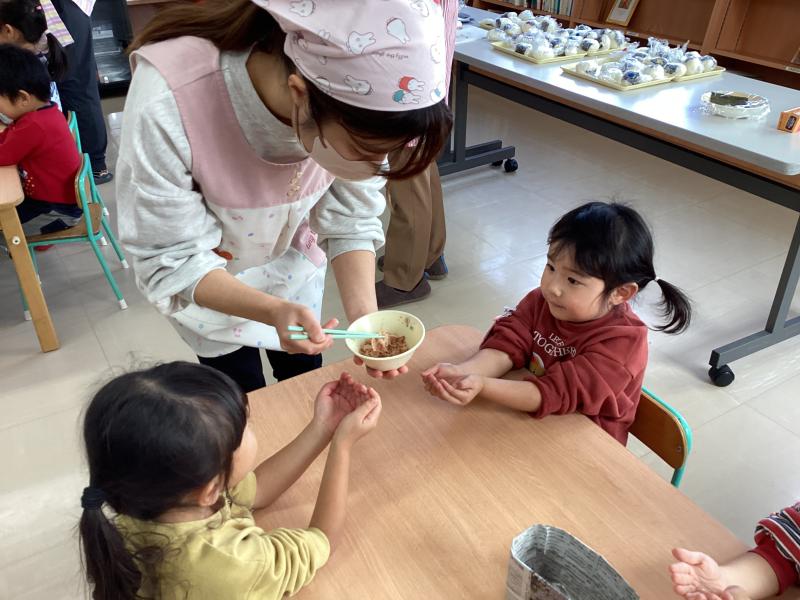 保護者の方からいただいた新米でおにぎりづくりをしました。また、「昆布」「にぼし」「鰹」を使って「だし」の味や香りの違いを感じてみました。つくったおにぎりとうーめん汁を食べて、「ありがとう」「完食できた」などと話す姿が見られ、感謝の気持ちや食べる意欲につながっていました。
