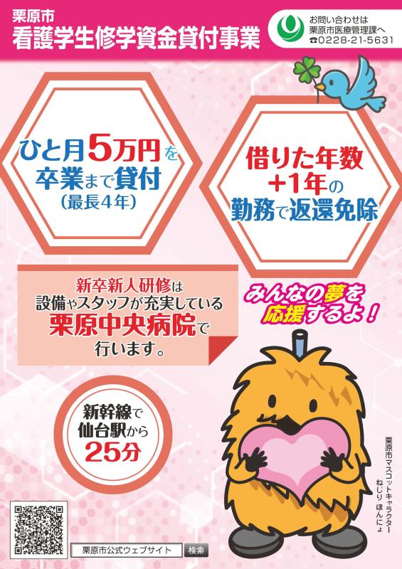 栗原市立病院及び市立診療所の看護師確保を図るため、学校など養成施設に在学している方で、将来、市立病院や市立診療所において看護師の業務に従事しようとする方を対象に、修学資金をお貸しします。
